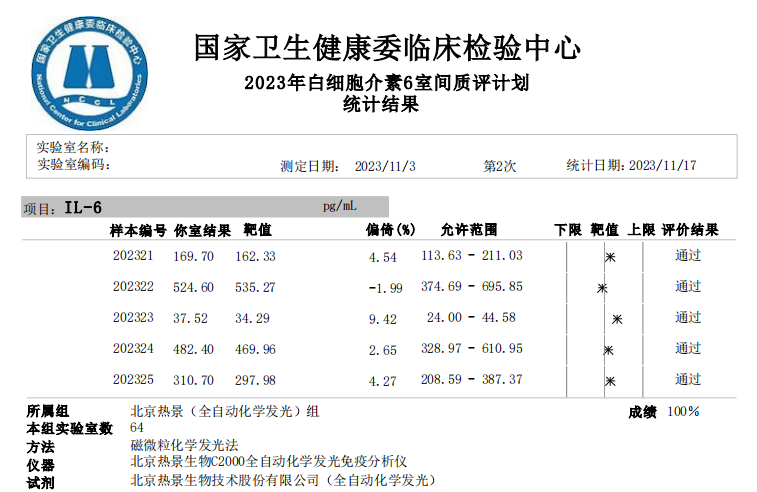 近日,國家衛(wèi)生健康委臨床檢驗中心(NCCL)公布了2023年第二次全國臨床檢驗室間質(zhì)量評價結(jié)果。經(jīng)了解,熱景生物心肌標(biāo)志物(肌酸激酶同工酶、肌紅蛋白、肌鈣蛋白I)、血清降鈣素原項目的上轉(zhuǎn)發(fā)光及化學(xué)發(fā)光兩大平臺產(chǎn)品,以及D-二聚體、白介素6、胃蛋白酶原項目的化學(xué)發(fā)光平臺產(chǎn)品均滿分通過此次室間質(zhì)量評價。同時,熱景生物參與的上海臨床檢驗中心2023年第二次能力驗證活動,包括AFP異質(zhì)體比率、B型鈉尿肽/N末端B型鈉尿肽前體、心肌標(biāo)志物(肌酸激酶同工酶、肌紅蛋白、肌鈣蛋白I)、血清降鈣素原等項目在內(nèi)的產(chǎn)品均通過評價。