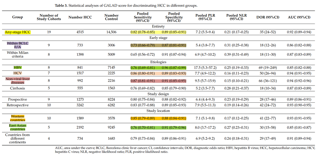 對于識(shí)別巴塞羅那臨床肝癌分期(BCLC)0/A期HCC,GALAD模型表現(xiàn)出良好的診斷準(zhǔn)確性,敏感度為0.73,特異性為0.87。針對不同病因引發(fā)的肝癌,GALAD模型在乙肝、丙肝及非病毒性肝病相關(guān)的肝癌檢測中,其敏感度依次為0.76、0.86和0.87,特異性則為0.96、0.89和0.91。