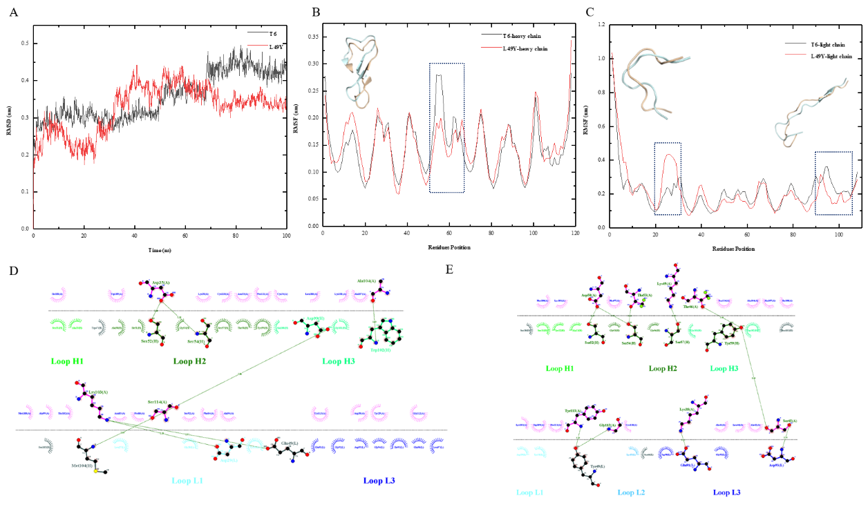 圖2:L49Y動力學模擬分析圖。(A) L49Y模擬過程RMSD圖;(B) L49Y重鏈模擬RMSF圖;(C) L49Y輕鏈模擬RMSF圖;(D) T6-TSLP相互作用分析圖;(E) L49Y-TSLP相互作用分析圖