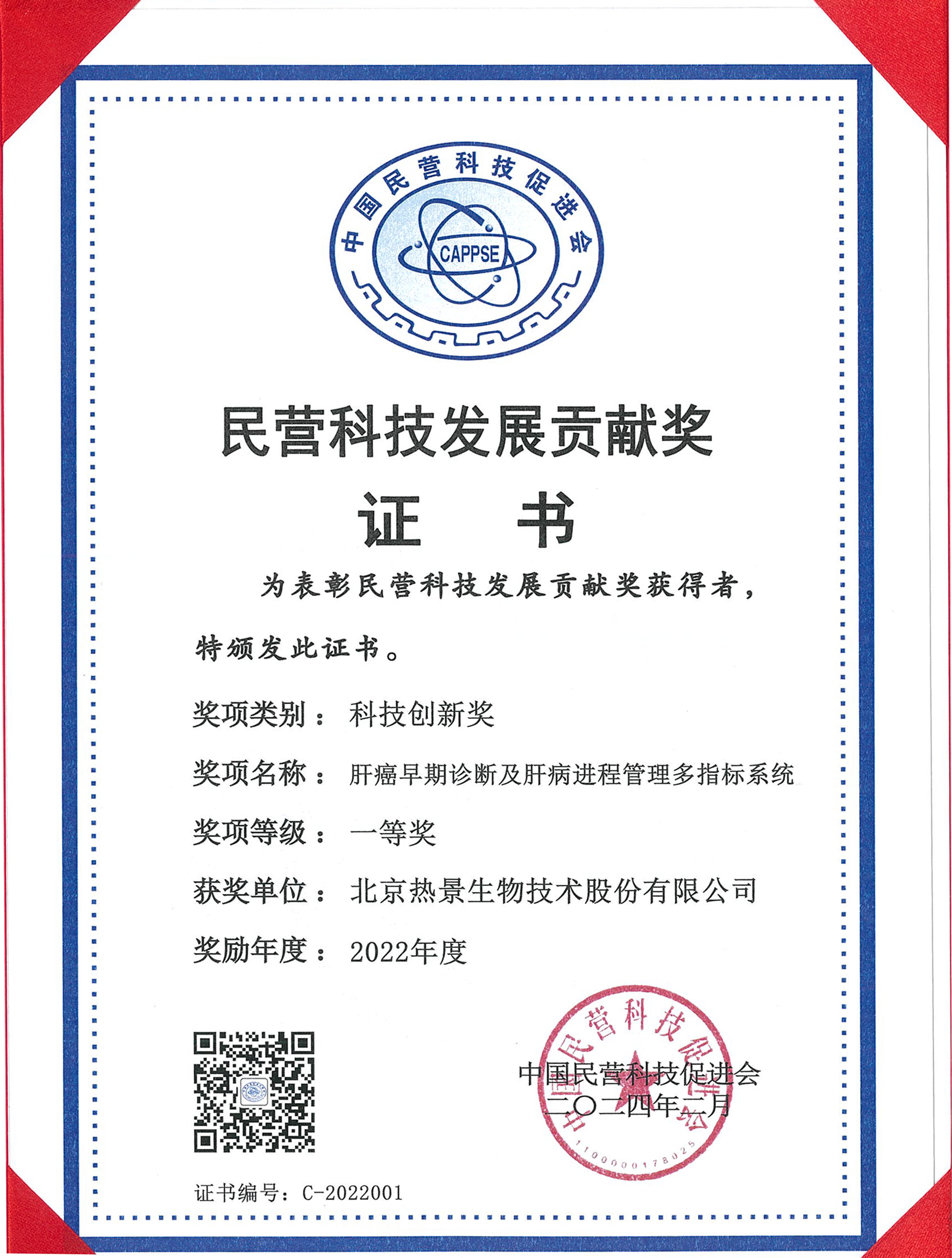 近日,中國民營科技促進會公布了“2022年度民營科技發(fā)展貢獻獎”獲獎企業(yè)名單,熱景生物“肝癌早期診斷及肝病進程管理多指標系統(tǒng)”項目榮獲“2022年度民營科技發(fā)展貢獻獎”科技創(chuàng)新一等獎。