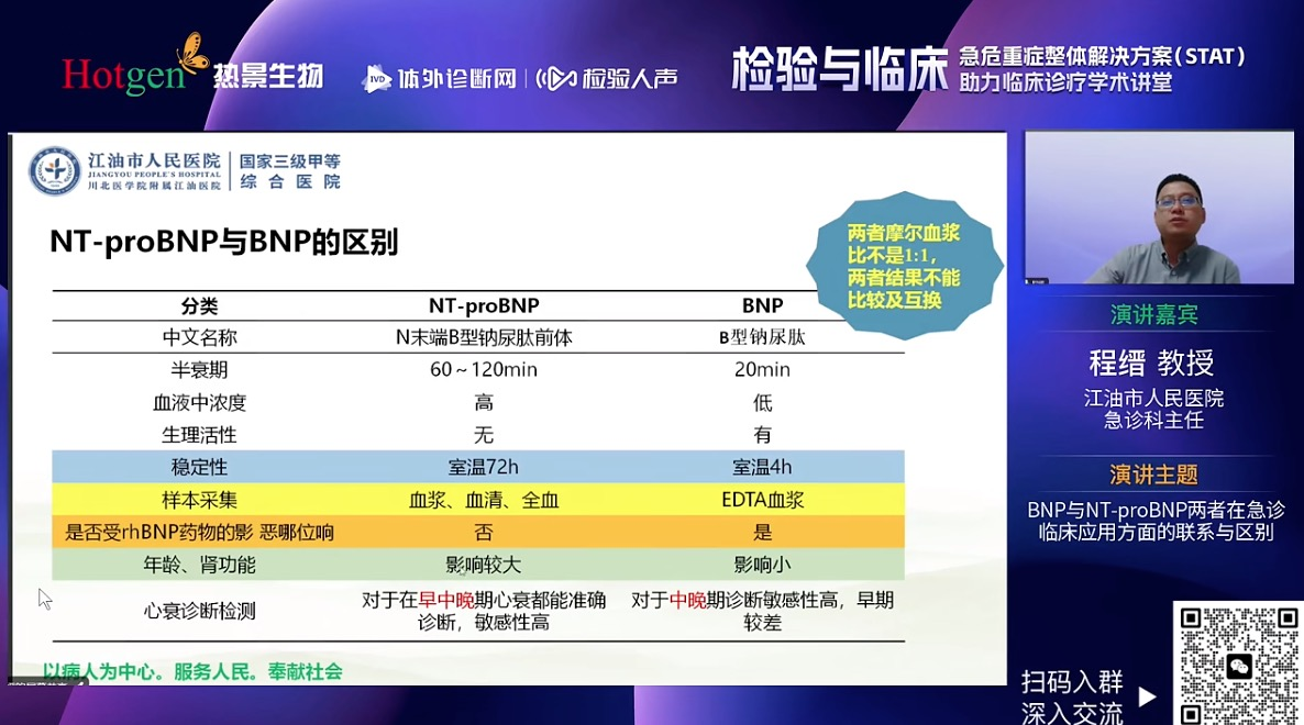 四川省江油市人民醫(yī)院急診科程縉教授就BNP與NT-proBNP兩個指標(biāo)進行了深入剖析,從BNP與NT-proBNP病理生理機制出發(fā),解析了BNP和NT-proBNP之間的區(qū)別,全面的闡述了影響B(tài)NP和NT-proBNP水平的因素,又從檢驗角度強調(diào)BNP/NT-proBNP質(zhì)量要求和性能評價。最后程教授回歸臨床分享BNP/NT-proBNP在心衰早期篩查與一級預(yù)防、心衰的診斷與鑒別診斷和心衰治療監(jiān)測和預(yù)后評估等臨床價值。
