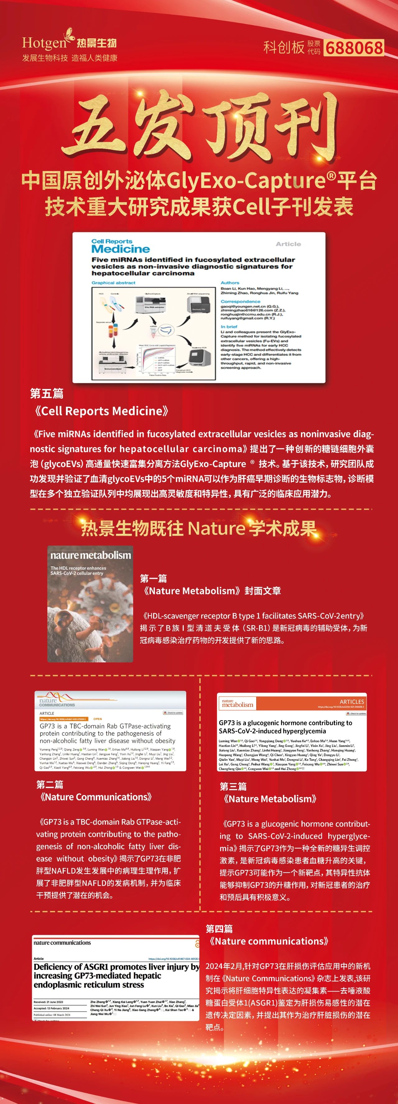 GIyExo-Capture?平臺(tái)是中國IVD科研創(chuàng)新創(chuàng)造的一個(gè)典范,針對(duì)全球范圍內(nèi)外泌體液體活檢應(yīng)用準(zhǔn)確率不高,操作繁瑣等臨床應(yīng)用挑戰(zhàn),提供了創(chuàng)新的解決方案。該平臺(tái)采用糖捕獲技術(shù),實(shí)現(xiàn)疾病相關(guān)外泌體全自動(dòng)、快速高通量分離,以及外泌體運(yùn)載microRNA的高靈敏度檢測(cè)。目前,熱景生物具有自主專利GIyExo-Capture?平臺(tái)開發(fā)的系列癌癥早期診斷成果陸續(xù)通過注冊(cè)檢驗(yàn)(胰腺癌、肝癌、胃癌等),相關(guān)神經(jīng)退行性疾病研發(fā)項(xiàng)目進(jìn)展順利。作為糖捕獲診斷方法學(xué)的提出者,熱景生物致力于將中國企業(yè)的原創(chuàng)性技術(shù)推廣應(yīng)用到全球臨床,為全球患者帶來更精準(zhǔn)、更便捷的診斷方案、使更多患者獲益于中國創(chuàng)新技術(shù)。