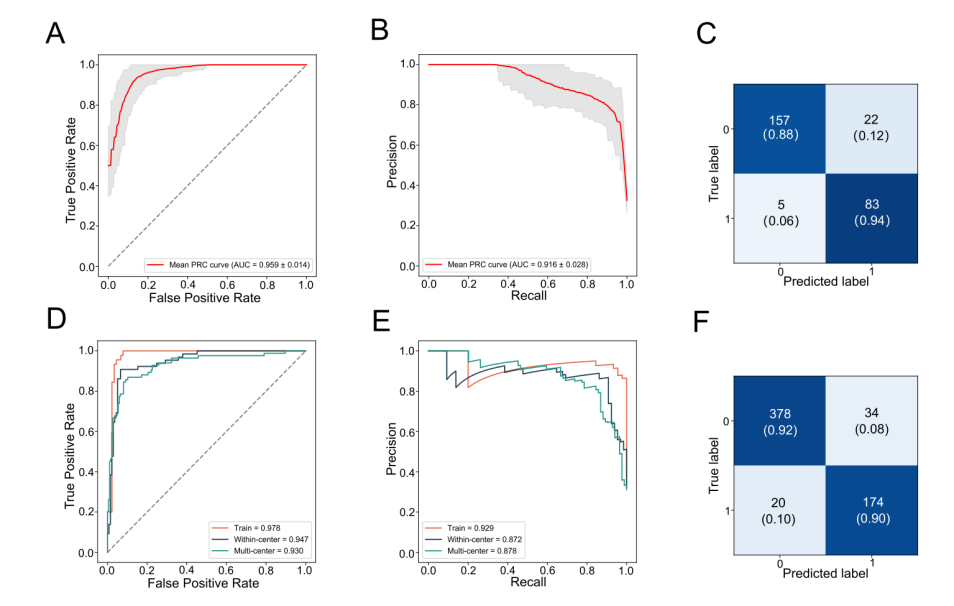 圖2.HCC預(yù)測(cè)模型在NGS (A-C)and qRT-PCR(D-F)數(shù)據(jù)中的性能評(píng)估