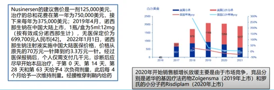 Nusinersen(諾西那生鈉):2016年首次上市,由Ionis研發(fā),是一種反義寡核苷酸(ASO),諾西那生鈉注射液可以改變SMN2前mRNA的剪接,從而增加完整長(zhǎng)度SMN蛋白的產(chǎn)生。2019年中國(guó)獲批上市,且于2021年納入國(guó)家醫(yī)保目錄。諾西那生鈉可用于出生3天的嬰兒到80歲的老人,適用人群非常廣泛。截止到2021年,全球有11000人使用過(guò)諾西那生鈉。