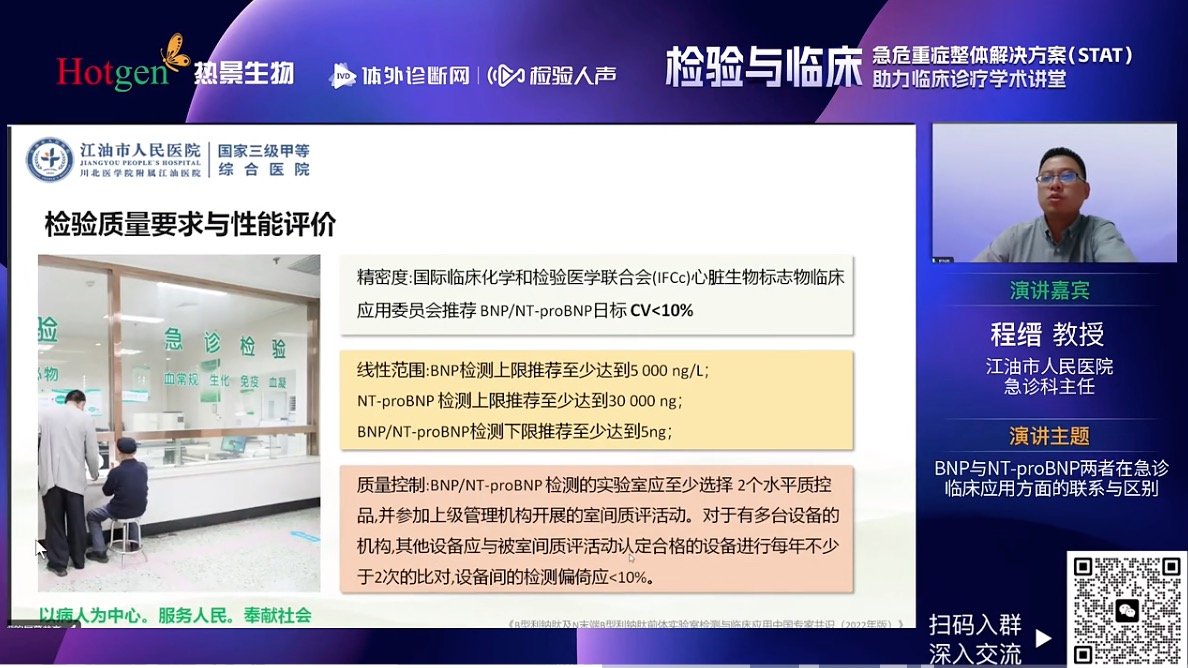 四川省江油市人民醫(yī)院急診科程縉教授就BNP與NT-proBNP兩個指標(biāo)進行了深入剖析,從BNP與NT-proBNP病理生理機制出發(fā),解析了BNP和NT-proBNP之間的區(qū)別,全面的闡述了影響B(tài)NP和NT-proBNP水平的因素,又從檢驗角度強調(diào)BNP/NT-proBNP質(zhì)量要求和性能評價。最后程教授回歸臨床分享BNP/NT-proBNP在心衰早期篩查與一級預(yù)防、心衰的診斷與鑒別診斷和心衰治療監(jiān)測和預(yù)后評估等臨床價值。