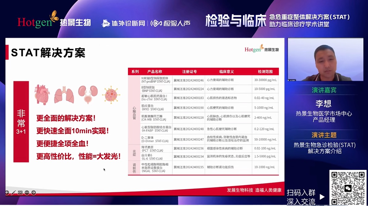 熱景生物醫(yī)學(xué)市場中心李想經(jīng)理根據(jù)臨床調(diào)研結(jié)果以及在急危重癥多樣化患者,分享熱景生物完整的急危重癥整體解決方案(STAT),并且分別闡述了不同場景匹配的解決方案,實現(xiàn)全血單人份10min準(zhǔn)確報告出具,目前涵蓋心腦血管、炎癥以及腎損傷相關(guān)指標(biāo)的全景解決方案,非常適用于胸痛中心、急診、ICU等臨床科室開展。