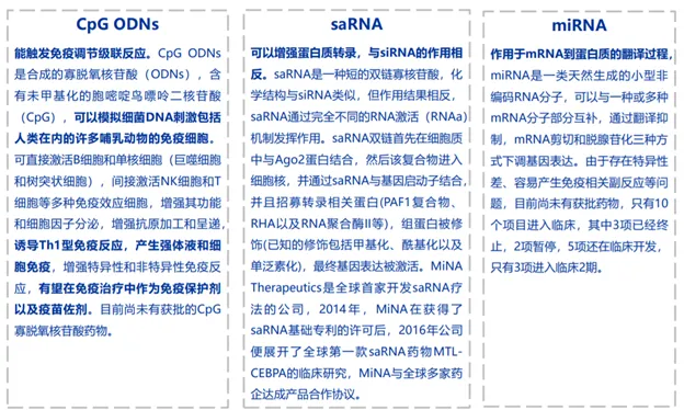 根據(jù)小核酸結(jié)構(gòu)、藥物機(jī)制、作用靶點(diǎn)的不同,發(fā)展出了多種類(lèi)型,包括反義寡核苷酸(ASO)、小干擾RNA(siRNA)、適配體RNA(aptamer RNA)、微小RNA(miRNA)、小激活RNA(saRNA)和CpG寡核苷酸 (CpG oligonucleotide)、核酶(ribozyme)、轉(zhuǎn)運(yùn)RNA(tRNA)、抗體核酸偶聯(lián)藥物(ARC)等。目前研究最熱門(mén)的小核酸藥物主要是ASO、siRNA 和Aptamer。