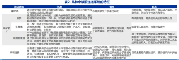 按照不同遞送技術(shù)分類(lèi),可以分為裸露RNA修飾遞送技術(shù)、脂質(zhì)體納米遞送技術(shù)、共軛連接遞送系統(tǒng)(小分子配體、抗體及其他分子)和其他多種類(lèi)型的新型遞送系統(tǒng)(如多聚體納米粒遞送系統(tǒng)、細(xì)胞外囊泡遞送系統(tǒng))。其中,LNP和GaINac技術(shù)相對(duì)成熟。GaINac技術(shù)主要靶向肝臟,未來(lái)靶向其他器官的藥物遞送系統(tǒng)也有望突破,如Alnylam和 Arrowhead正在研發(fā)的針對(duì)中樞神經(jīng)系統(tǒng)、眼睛、腎癌細(xì)胞與肺上皮細(xì)胞等遞送系統(tǒng)。