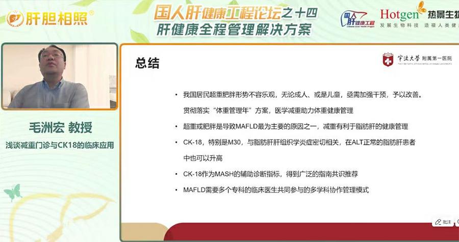 寧波大學(xué)附屬第一醫(yī)院內(nèi)分泌科毛洲宏教授在會議上圍繞“減重門診與CK18的臨床應(yīng)用”作專題報告,強(qiáng)調(diào)國家衛(wèi)健委“體重管理年”政策推動下,醫(yī)療機(jī)構(gòu)需加強(qiáng)減重門診建設(shè),為超重及肥胖人群提供專業(yè)化服務(wù)。毛教授也以本院“肥胖俱樂部”在開設(shè)近十年的真實經(jīng)驗,給我們科普了減重管理的重要性。目前,我國超重肥胖形勢嚴(yán)峻,超50%成人存在體重異常,肥胖與代謝相關(guān)脂肪性肝?。∕AFLD)密切相關(guān),約20% MAFLD患者可能進(jìn)展為脂肪性肝炎(MASH),T2DM患者合并MAFLD比例高達(dá)65.04%。毛教授指出,傳統(tǒng)檢測手段如ALT、B超在早期診斷MASH及纖維化中存在局限性,而細(xì)胞角蛋白18(CK-18)片段作為新型生物標(biāo)志物,通過M30/M65片段可無創(chuàng)評估肝細(xì)胞凋亡與壞死,其敏感性與特異性顯著優(yōu)于傳統(tǒng)指標(biāo)。此外,MAFLD需多學(xué)科協(xié)作管理,結(jié)合減重、改善代謝、抗纖維化等綜合干預(yù)措施,定期監(jiān)測高危人群。毛教授總結(jié)稱,CK18的應(yīng)用將推動MAFLD精準(zhǔn)診療,而政策支持與多學(xué)科模式普及,為肥胖及相關(guān)代謝疾病防控注入新動力。