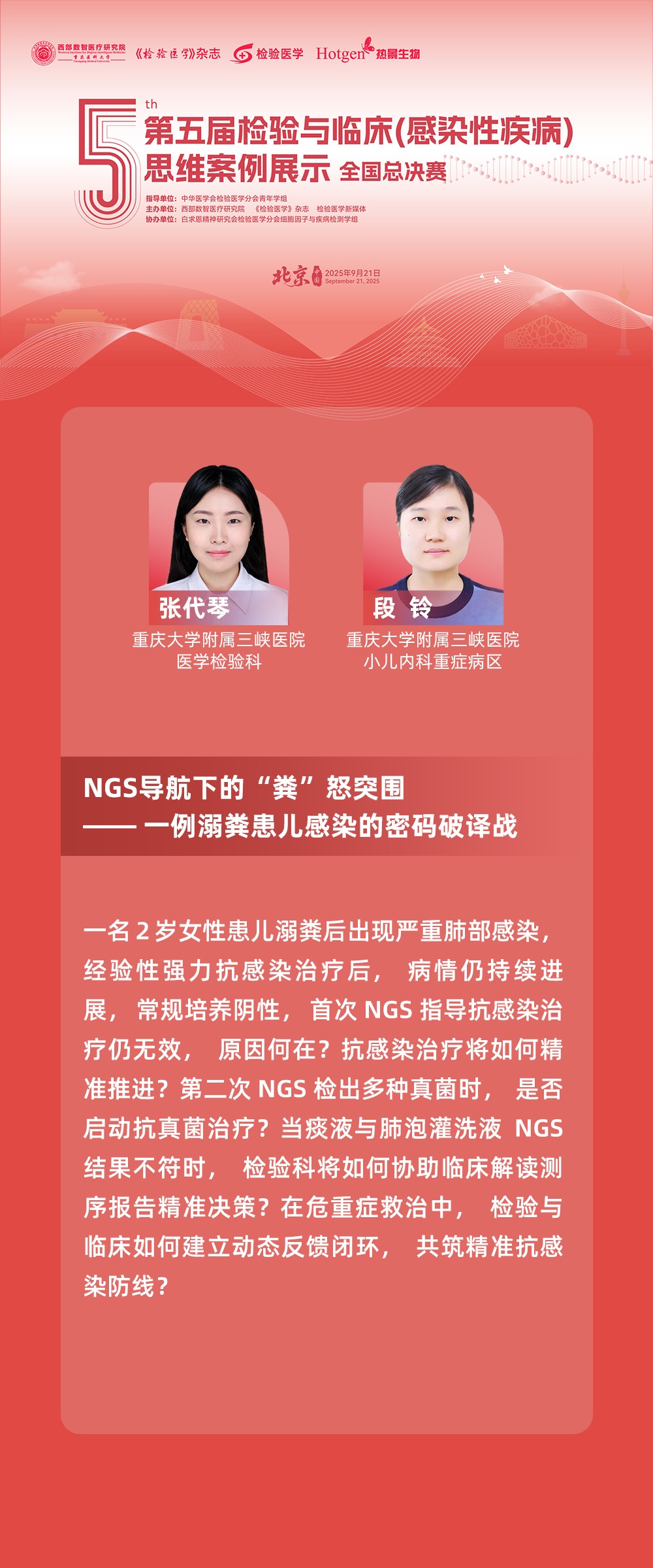 為了更有效地推進檢驗與臨床之間的溝通,促進跨學科交流與合作,實現(xiàn)檢驗與臨床的融合發(fā)展,在大會召開期間,舉辦了檢驗與臨床思維案例展示活動暨“2025年全國檢驗與臨床思維案例展示總決賽”。其中,由熱景生物支持的“第五屆檢驗與臨床(感染性疾病)思維案例展示全國總決賽”冠軍組案例,即來自遵義市第一人民醫(yī)院的《“三低一高”矛盾體,一例細小病毒(B19)感染導致的純紅細胞再生障礙性貧血》、重慶大學附屬三峽醫(yī)院的《NGS導航下的“糞”怒突圍——一例溺糞患兒感染的密碼破譯戰(zhàn)》案例入選“2025年全國檢驗與臨床思維案例展示總決賽”。