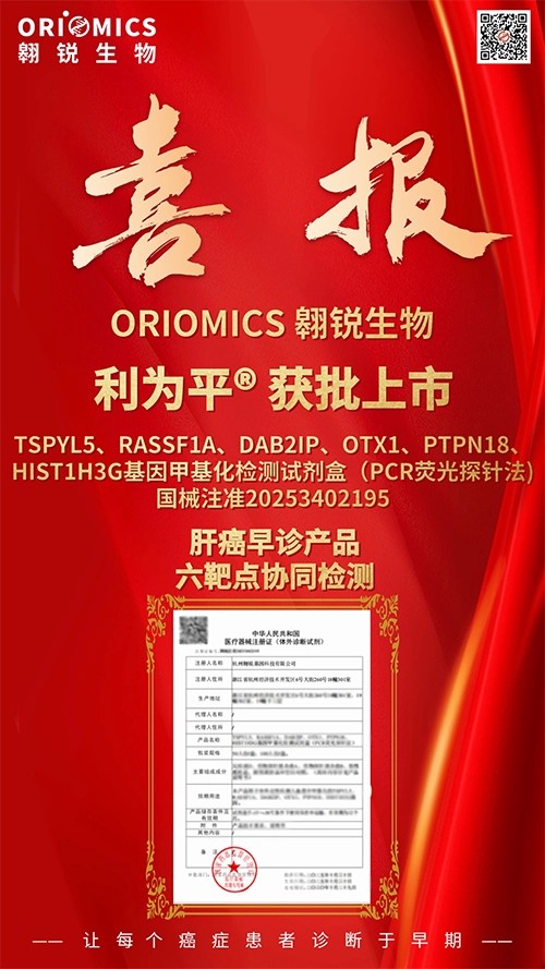 近日,熱景生物重要參股公司翱銳生物自主研發(fā)的利為平?——TSPYL5、RASSF1A、DAB2IP、OTX1、PTPN18、HIST1H3G基因肝癌甲基化檢測(cè)試劑盒(PCR熒光探針法)獲得國(guó)家藥品監(jiān)督管理局頒發(fā)的Ⅲ類醫(yī)療器械注冊(cè)證(注冊(cè)證號(hào):國(guó)械注準(zhǔn)20253402195)。該產(chǎn)品用于體外定性檢測(cè)人血漿中相關(guān)基因甲基化,適用于臨床上對(duì)疑似原發(fā)性肝癌的輔助診斷。